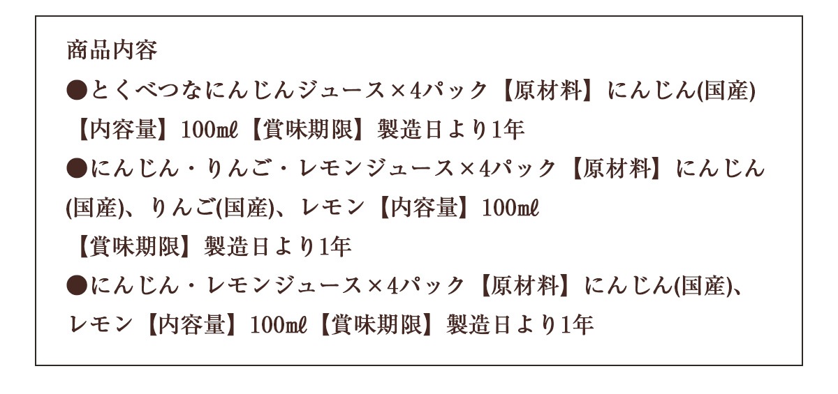 冷凍ジュース > とくべつなにんじんジュース > 【お試し ギフト】3種類のにんじんジュース初めてセット(12パック)【冷凍ジュース】【にんじんジュース】【送料無料】